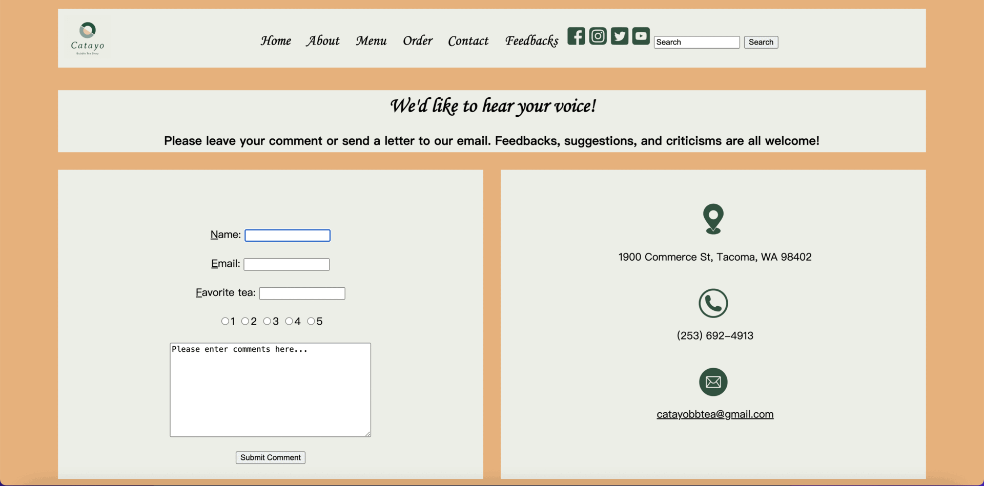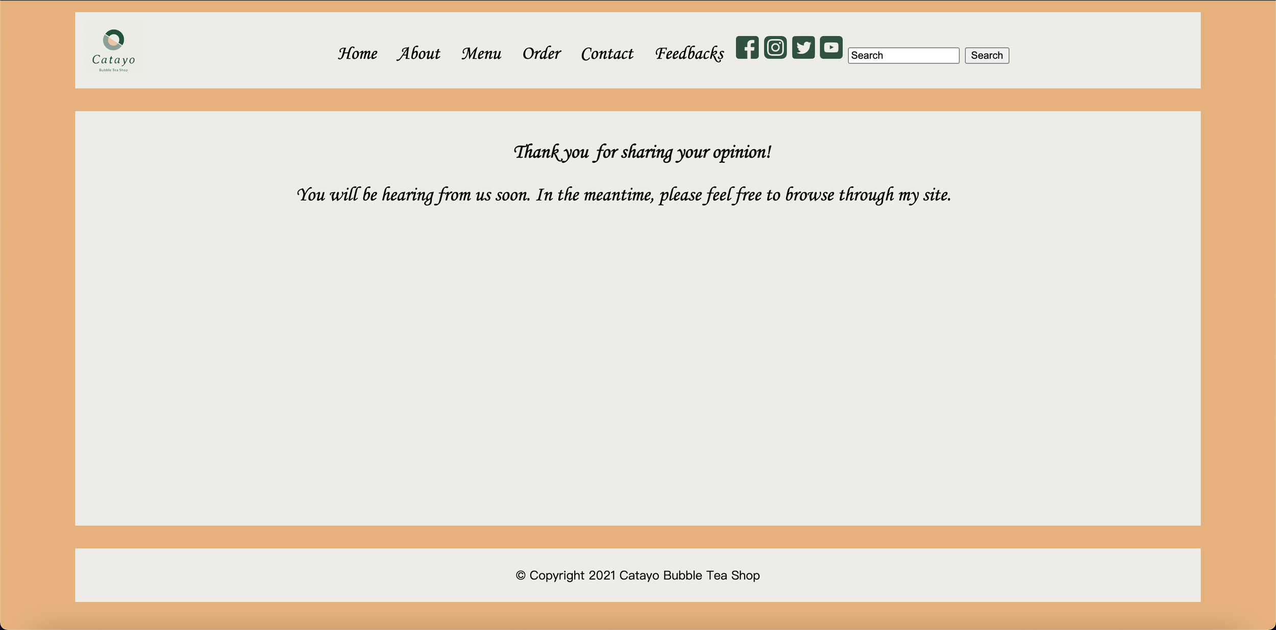 The website has been uploaded to the server of the University of Washington and officially launched on June 2, 2021. The design of Catayo Bubble Tea Shop's website was well received by peers in the T INST 312 Web Design course and became the course's most popular website in peer ratings. Since the design and programming of this website are under deadline pressure, I will consider more accessibility features and designs in my future web design works.