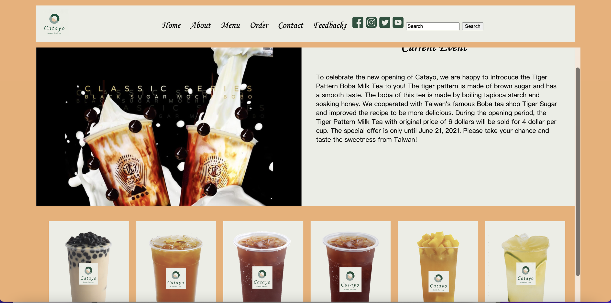 Catayo Bubble Tea Shop is a website designed to allow consumers to order bubble tea online while learning the history of Taiwanese bubble tea through artistic images and videos, as well as providing ratings and feedback for their favorite items.